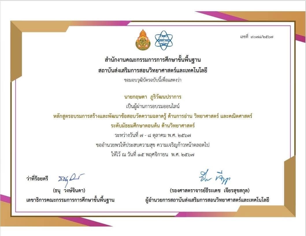 ครูผู้สอนนักเรียน ได้รับรางวัลระดับเหรียญทอง กิจกรรม การแข่งขันจัดสวนถาดแบบชื้น ระดับชั้น ม.1 - ม.3 งานศิลปหัตถกรรมนักเรียน ครั้งที่ 72 ปีการศึกษา 2567 ระดับสำนักงานเขตพื้นที่การศึกษา ระหว่างวันที่ 23 - 24 มกราคม 2568 จากสำนักงานเขตพื้นที่การศึกษามัธยมศึก |